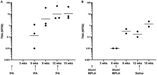Immunogenicity of the LND-VLP in rabbits. Shown in (A) are TNA titers from sera obtained at 6, 9, 12 and 15 weeks post-priming immunizations from a group of rabbits (n = 3) immunized three times with the LND-VLP in an emulsion with IFA, or in (B) a group of rabbits (n = 2) immunized twice with the LND-VLP using Alum/MPLA and given a third injection with the LND-VLP in saline only. Arrows denote the immunization time points for both groups at priming (time 0) and at 6 and 12 weeks post-priming immunizations. Bleeds obtained at 6 and 12 weeks were procured prior to immunizations. Horizontal lines are geometric means.
