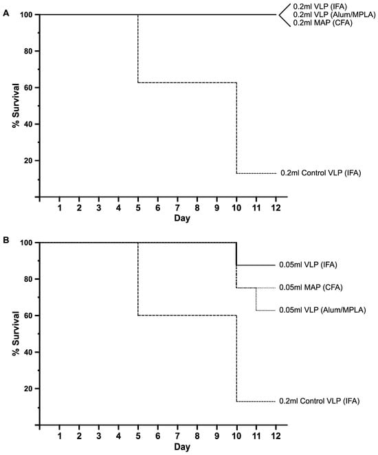 Passive protection of mice from anthrax aerosol spore challenge using rabbit antisera to the LND-VLP. Kaplan–Meier survival curves from groups of A/J mice which were passively immunized with rabbit antisera prior to aerosol challenge with 5 LD50s of B. anthracis Sterne strain as described in methods. One day prior to aerosol challenge, groups of mice (n = 8) were passively immunized with a single medium (0.2 mL) or low (0.05 mL) dose of week-15 antisera from a rabbit immunized three times with the LND-VLP in IFA or the LND-VLP using Alum/MPLA/saline. The positive control sera (MAP-CFA/IFA) was obtained from a rabbit at approximately 10 weeks post-priming immunization which had been immunized 5 times in two-week intervals with an LND-MAP vaccine in an emulsion with CFA/IFA prior to undergoing and surviving a 200 LD50-targeted Bacillus anthracis Ames strain aerosol spore challenge in a prior study [30]. A single negative control group of mice (n = 8) received a medium dose (0.2 mL) of antisera from a rabbit immunized three times with an irrelevant VLP in Alum/MPLA. In (A), 8/8 (100%) mice in all of the medium-dose LND antisera groups survived, while 1/8 (12.5%) mice receiving the control sera survived to day 14 (p = 0.00001, log rank compared to negative control). In (B), 7/8 mice (87.5%) receiving the low-dose sera from a rabbit immunized with the LND-VLP/IFA survived, while 5/8 mice (62.5%) and 6/8 (75%) mice receiving the low-dose sera from a rabbit immunized with the LND-VLP/Alum/MPLA/saline or the positive control LND-MAP sera survived to day 14, respectively (p = 0.0001 log rank for all low-dose groups compared to control).