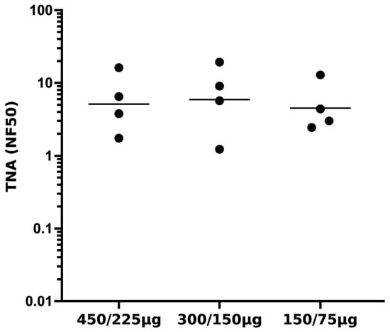 The ability of antibody to block LeTx cytotoxicity in vitro was assessed using the RAW264.7 cell line (American Type Culture Collection, Manassas, VA, USA) as described [43]. For neutralization studies, approximately 120 ng/mL of PA (PA 171E, List Labs, Campbell, CA, USA) and 25 ng LF (LF169L, List Labs, Campbell, CA, USA) were used in the TNA. Contemporaneous toxin dose 50% (TD50) was determined for PA and LF with each assay to validate that the toxin concentrations used in each TNA were sufficient for greater than 90% cytotoxicity (4 TD50s). The reciprocal of the effective dilution (ED) protecting 50% of the cells from cytotoxicity (ED50) [44] was determined for each serum by using nonlinear regression to fit a variable-slope sigmoidal equation to the serial dilution data set using Prism 10.0. TNA results are displayed as NF50s (NF50 = ED50 sample/ED50 AVR801), which normalize the TNA results to AVR801 (human anti-AVA reference serum AVR801, Lot 2, BEI Resources, Manassas, VA, USA) [14]. The standard TNA has a lower limit of quantification of 16. Samples with a TNA below this limit were assigned a value of 8 (0.01 NF50).