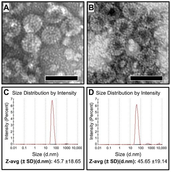 Transmission electron microscopy and dynamic light scattering of the lyophilized and soluble forms of the LND-VLP. Transmission electron microscopy of the non-lyophilized (A) and lyophilized and reconstituted LND-VLP (B). Magnification = 40,000×. Scale bar = 50 nm. In (C,D) are shown the results from dynamic light scattering sizing for the non-lyophilized (C) and lyophilized/reconstituted (D) LND-VLP nanoparticles.