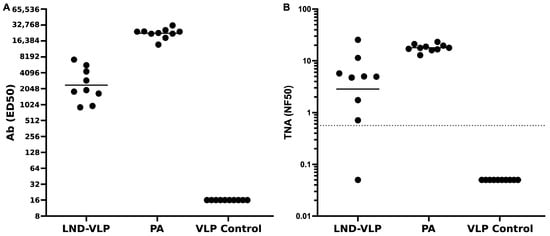 Antibody and TNA titers in groups of rabbits immunized using a pre-aerosol spore challenge immunization regimen. Groups of rabbits (n = 10) were immunized with either the lyophilized and reconstituted LND-VLP in Alum/MPLA, PA83 in Alum (positive control) or an irrelevant VLP (negative control) in Alum/MPLA at wk 0. The PA control group was boosted at week 4 with PA in Alum, and both VLP groups were boosted at week 5 with their respective immunogens in Alum/MPLA. Sera were obtained at 9 weeks post-priming for analysis of Ab (A) and TNA (B) titers at a time point designed to simulate when an anthrax spore aerosol challenge would typically occur. Horizontal lines represent geometric means. The dotted line in (B) represents an NF50 of 0.56, which has been shown to predict a 70% likelihood of protection in rabbits, and an 88% probability of protection of NHPs [14].