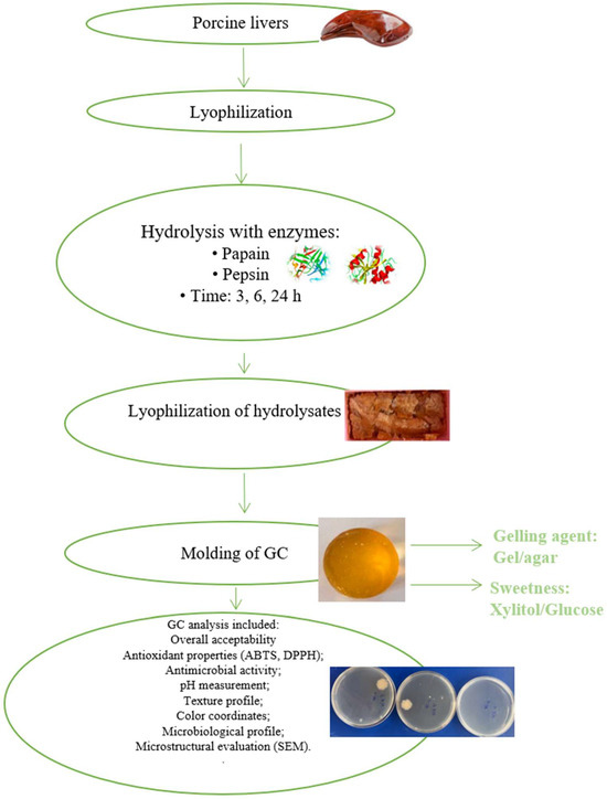 The gummies developed with liver hydrolysate could be a healthier alternative to traditional gummies or jelly beans, and their production could enable the sustainable use of by-products. Porcine liver is a significant and promising source of bioactive peptides. The hydrolysis time and enzyme type significantly influenced the properties of gummy candies (p < 0.05).