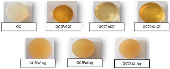 During the research, seven different gummy candy formulations were developed (Table 1). Agar powder (from Gelidium sesquipedale algae; Ag) and gelatin (Gl) were purchased from Rotmanka (Gdańsk, Poland) and Klingiai (Kaunas, Lithuania), respectively. Sweetness was achieved using either xylitol (Natur Hurtig, Nuremberg, Germany) or sugar (Sanitex, Kaunas, Lithuania). Citric acid was obtained from a local retailer (UAB “Maxima LT”, Kaunas, Lithuania) and ascorbic acid was obtained from Valentis (Vilnius, Lithuania). Chewy candies were prepared by incorporating various hydrolysates (2 g or 5 g). To mask undesirable taste notes of hydrolysates, the flavoring agent 23490 Lime flavor (Stockmeier Food GmbH, Zeppelinstraße 7, Herford, Germany) in liquid form was incorporated in water. Initially, the Ag powder was solubilized by heating at 100 °C for 3 min in water. When preparing GC with gelatin, the GI powder was first dissolved in water for 30 min at 30 ± 2 °C, then melted at 80 ± 2 °C. Then, sugar and/or xylitol were added while boiling, and the mixture was further heated with constant stirring. Later, citric acid (or ascorbic acid), hydrolysates, and a flavoring agent were added to the gummy candy mass after thorough mixing; the prepared mixture was poured into silicone molds (circular shape) (ø 1.9 cm, height 1.5 cm); the weight of one gum was 2.05 ± 0.18 g before drying and 2.01 ± 0.12 g after drying (Figure 2).