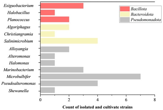 A total of 32 bacteria strains were successfully isolated and cultivated from this tidal flat sediment sample collected in Hangzhou Bay. The 16S rRNA gene sequence identity analysis pointed out that those strains could be classified into three phyla (Figure 1), including Bacillota, Bacteroidota, and Pseudomonadota. Bacillota strains were identified as three genera consisting of Exiguobacterium (n = 3), Halobacillus (n = 1), and Planococcus (n = 2). Bacteroidota strains were determined as three genera containing Algoriphagus (n = 2), Christiangramia (n = 1), and Salinimicrobium (n = 4). Pseudomonadota strains were regarded as seven genera comprising Alloyangia (n = 2), Alteromonas (n = 1), Halomonas (n = 1), Marinobacterium (n = 3), Microbulbifer (n = 7), Pseudoalteromonas (n = 4), and Shewanella (n = 1). Detailed 16S rRNA gene sequence identities and their top hit type strains are listed in Table S2. Among them, one white strain, designated as CYL-A6T and belonging to the genus Alteromonas, was found to have low 16S rRNA gene sequence identities (≤97.7%) with existing type strains, indicating that strain CYL-A6T was considered to represent a novel species in the genus Alteromonas. Meanwhile, strain CYL-A6T was also deposited into the Korean Collection for Type Cultures (KCTC 8709T) and Marine Culture Collection of China (MCCC 1K09369T).