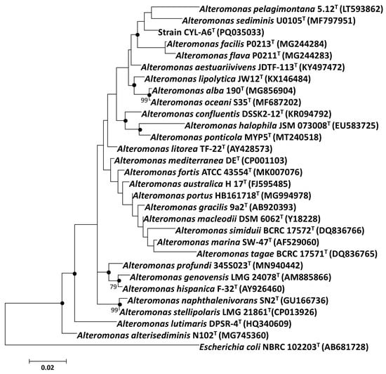 Maximum-likelihood phylogenetic tree based on 16S rRNA gene sequences showing phylogenetic relationships of strain CYL-A6T and Alteromonas type strains. Bootstrap values are based on 1000 repetitions. Bar, 0.02 substitutions per nucleotide position. Filled circles indicate the same node recovered in the neighbor-joining phylogenetic tree (Figure S1). Escherichia coli NBRC 102203T (AB681728) was used as an outgroup.