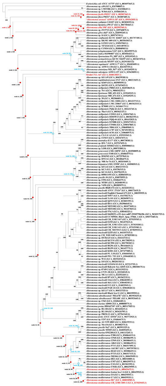 Maximum likelihood phylogenomic tree based on the GTDB database showing the phylogenetic relationships of strain CYL-A6T (in red) and Alteromonas type strains. Bootstrap values are based on 1000 replicates. Bar, 0.1 substitutions per amino acid position. Escherichia coli ATCC 11775T (GCA_003697165.2) was used as an outgroup.