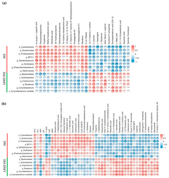 3.8. Correlation Analysis Among Significantly Different Fecal Microbiome, Plasma Metabolites, SCC, and Blood Parameters