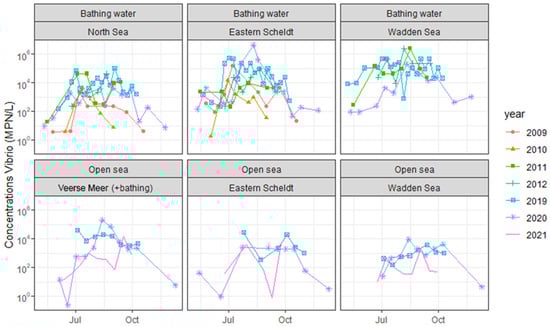 Vibrio concentrations at bathing sites and open sea in The Netherlands, 2009–2021.