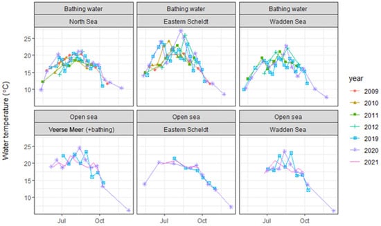 Water temperature at bathing sites and open sea in the Netherlands, 2009–2021.