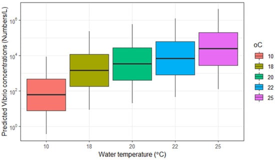 Predicted Vibrio concentrations in water in different water temperature scenarios.