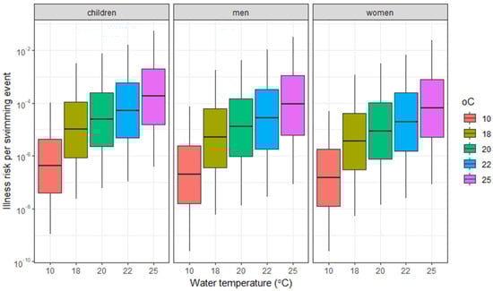 Risks of illness resulting from water ingestion while swimming in surface water contaminated with Vibrio were estimated using the parameters shown in Table 1, and the predicted Vibrio concentrations, which were calculated with Equation (1) and shown in Table 4. The 5–95 percentile values in this table reflect the range of predicted concentrations. Table 5 and Figure 4 show the risk of illness for children, women and men per single swimming event in different water temperature scenarios. The increased risk of increasing water temperature is clearly visible. In agreement with the level of exposure (i.e., the amount of water ingested), the risks are highest for children, followed by men and women. At a water temperature of 10 °C the 95-percentile values of the risks range from 5.1 × 10−5 to 1.1 × 10−4, at 18 °C, they range from 1.3 × 10−3 to 2.9 × 10−3, and at 25 °C from 2.5 × 10−2 to 5.0 × 10−2, showing an increased risk at higher water temperatures.