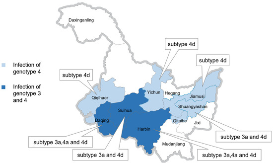 Distribution of confirmed genotypes and subtypes of swine HEV detected from seven districts in Heilongjiang Province of China.