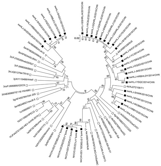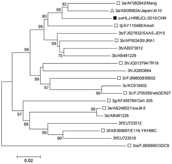 A phylogenetic tree demonstrating the alignment of the partial ORF2 852 bp of the swHLJ-HRBJCL/2015/CHN strain from the present study. The complete ORF2 sequence of swHLJ-HRBJCL/2015/CHN and referenced genotype 3 isolates with the complete ORF2 sequence available in GenBank (except for the referenced HM439285 with 1681 bp within the complete ORF2 sequence). The tree was constructed by using the neighbor-joining method and evaluated by using the interior branch test method with MEGA7 software. The percentage of bootstrap support is indicated at each node. Subtype, source, GenBank accession number, and country of origin are indicated in the referenced HEV isolates. Strains identified in this study are indicated by black squares and the highest sequence homology to our typical sequences are indicated by white triangles. White squares denote the typical HEV genotypes and subtypes of GenBank sequences according to Smith et al. [33]. Bootstrap values were determined with 1000 replicates. Scale bars indicate the nucleotide substitutions per site.