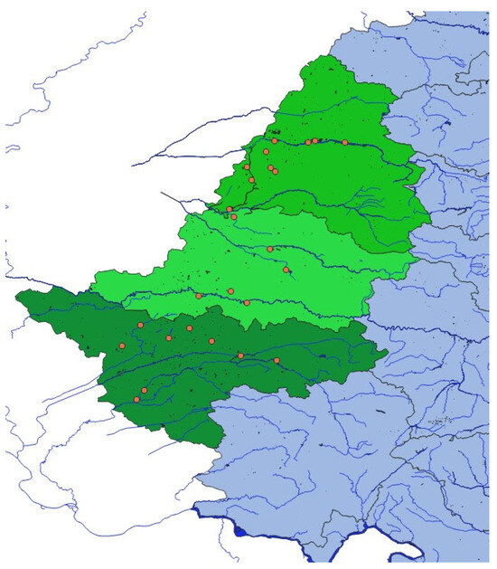 Geographic distribution of WNV-positive horses in the study area of western Romania. Red dots indicate the locations of positive cases detected during the survey.