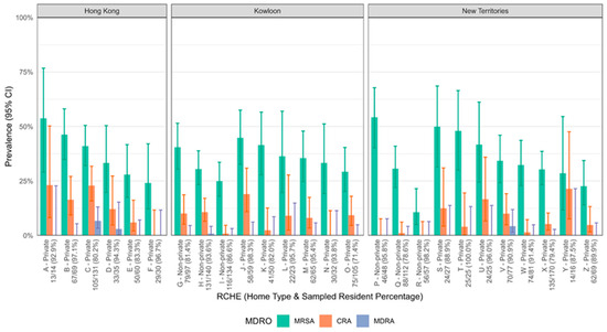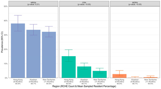 Compared with non-private homes, private homes had a greater prevalence of MDROs (Figure 3). Specifically, the prevalence of CRA was 9.9% (95% CI 8.2–11.9%) in private homes, which was higher than that of non-private homes, which was 4.7% (95% CI 3.1–6.8%), p < 0.05. Figure 4 shows the prevalence of MDROs stratified by geographical region. The results revealed that RCHEs in the Hong Kong region had a greater prevalence of all MDROs, followed by the Kowloon region and then the New Territories, except that the MDRA was similar for both Kowloon and the New Territories, with 0.2% (0–0.9%) and 0.5% (0.2–1.4%), respectively. The differences in the prevalence of MDROs by region were statistically significant for CRA and MDRA.