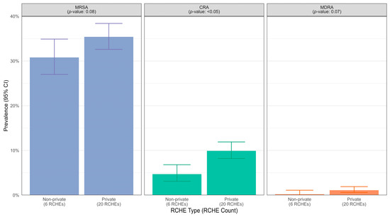 Prevalence of methicillin-resistant Staphylococcus aureus (MRSA), carbapenem-resistant Acinetobacter (CRA), and multidrug-resistant Acinetobacter baumannii (MDRA) in Residential Care Homes for the Elderly (RCHEs), stratified by RCHE type.