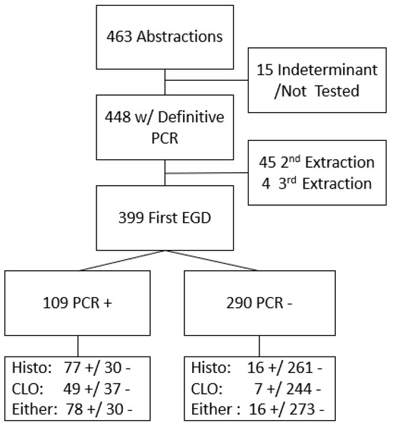 Flow of participants through PCR and compared by Histopathology (Histo) or Campylobacter-like organism test (CLOtest) diagnostic testing result either alone or together. + indicates a positive result; - indicates a negative result.
