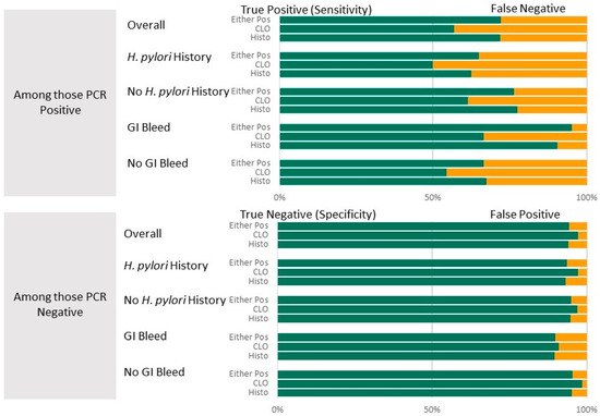 H. pylori detection tests have known determinants that impact their diagnostic accuracy. Rapid urease tests (e.g., a CLOtest) have been noted to return frequent false negative results with recent use of antibiotics, bismuth-containing compounds, proton pump inhibitors (PPIs), and the presence of intestinal metaplasia [7], atrophic gastritis [8], or upper gastrointestinal (GI) bleeding [9]. The sensitivity of histopathological analysis is similarly reduced by upper GI bleeding [10,11], atrophic gastritis [12], recent PPI therapy, or the presence of intestinal metaplasia [13]. Older studies compared RUTs with histopathology and showed somewhat improved sensitivity in the setting of upper GI bleeding [10,14,15]. Additionally, the accuracy of histopathologic evaluation depends on the skills of the microscopist or pathologist [13].
