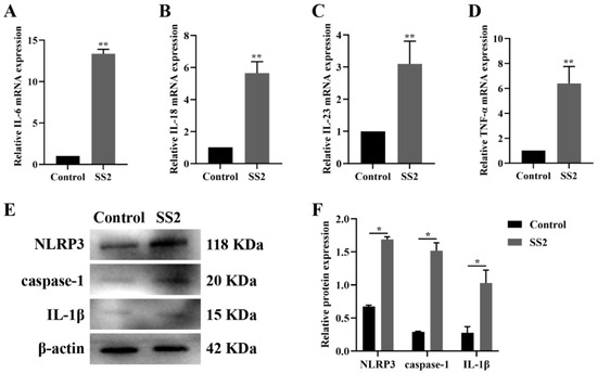 The activation of the NLRP3 inflammasome triggers caspase-1-mediated proteolytic cleavage and subsequent activation of IL-1β and IL-18, thereby instigating an inflammatory cascade [26]. To determine whether SS2 could elicit an inflammatory response, we exposed J774A.1 cells to SS2 at a MOI of 10 for a duration of 6 h. The mRNA expression levels of inflammatory factors in J774A.1 cells were subsequently assessed using qRT-PCR analysis. Following SS2 infection, we observed a marked upregulation in the expression of IL-6, IL-18, IL-23, and TNF-α compared to the control group (Figure 1A–D). Additionally, SS2 infection resulted in a substantial increase in the protein levels of NLRP3 and caspase-1, which are key components of the NLRP3 inflammasome (Figure 1E,F). Furthermore, the protein level of IL-1β was significantly elevated after SS2 infection (Figure 1E,F). These findings indicate that SS2 infection can enhance the secretion of inflammatory cytokines and activate the NLRP3 inflammasome.