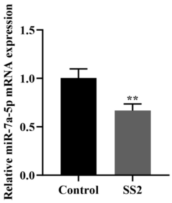 The expression of miR-7a-5p was inhibited in J774A.1 cells upon exposure to SS2. The expression level of miR-7a-5p was validated through qRT-PCR, where its levels were quantified relative to U6 snRNA and are presented as fold changes compared to the control samples. The data are presented as the mean ± SEM (n = 6 per group). Statistical significance is indicated as follows: ** p < 0.01.