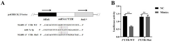 NLRP3 mRNA is a target of miR-7a-5p. (A) A diagram illustrates the predicted targeting sequences between miR-7a-5p and the 3′UTR of NLRP3 mRNA. (B) Luciferase activity was measured in 293T cells that were co-transfected with either the WT or Mut NLRP3-3′UTR constructs, along with miR-7a-5p mimics or their negative control (NC). The data are presented as the mean ± SEM (n = 6 per group). Statistical significance is denoted as follows: ** p < 0.01; ns: not significant. WT: wild-type; Mut: mutant-type; NC: miR-7a-5p negative control; mimics: miR-7a-5p mimics.
