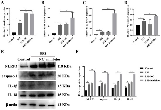 Inhibition of miR-7a-5p promoted the NLRP3/caspase-1 signaling pathway in J774A.1 cells during SS2 infection. (A–D) qRT-PCR was employed to detect the mRNA expression levels of IL-6, IL-18, IL-23, and TNF-α in the Control group, the SS2 group, the SS2+NC group, and the SS2+inhibitor group. (E,F) WB analysis was performed to assess the expression levels of NLRP3, caspase-1, IL-1β, and IL-18 in the Control group, the SS2 group, the SS2+NC group, and the SS2+inhibitor group. For qRT-PCR analysis, GAPDH was employed as the internal control for normalization. The mean fold changes in gene expression, relative to those in the Control group, were calculated using the 2−ΔΔCT method. The data are presented as the mean ± SEM (n = 6 per group). Statistical significance is indicated as follows: * p < 0.05, ** p < 0.01.