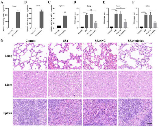 miR-7a-5p mitigated inflammation in mice triggered by SS2 infection. (A–C) The expression of miR-7a-5p was validated using qRT-PCR in the lung, liver, and spleen tissues. The relative expression levels of miR-7a-5p were determined by normalizing to the expression of U6 snRNA and are presented as fold changes compared to the NC samples. (D–F) Histological score was performed on tissue sections derived from the lung, liver, and spleen of mice. (G) Tissue sections from the lung, liver, and spleen of mice in the Control group, the SS2 group, the SS2+NC group, and the SS2+mimics group were stained using H&E. Scale bar, 20 μm. The data are presented as the mean ± SEM (n = 3 per group). Statistical significance is indicated as follows: ** p < 0.01, *** p < 0.001.