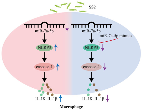 Proposed model by which miR-7a-5p attenuates SS2-induced inflammation through inhibiting NLRP3 inflammasome/caspase-1 signaling pathway.