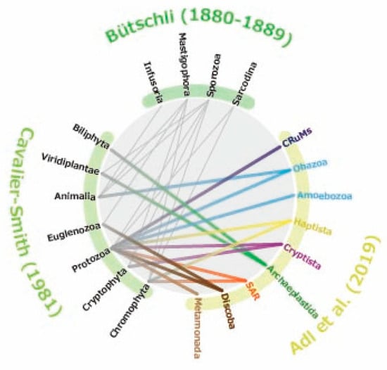 Since Antonie van Leeuwenhoek first observed microorganisms under the microscope in the 17th century, protists have been described and classified primarily based on observations made with light microscopes. For centuries, these organisms were incorporated into the traditional dichotomous classification system of the Animal and Plant kingdoms. In early microscopical studies by Müller (1786) [] and Ehrenberg (1838) [], protists, including photosynthetic flagellates, were placed within the Infusoria, a group assigned to the kingdom Animalia. In contrast, many botanists considered non-motile algae, such as Closterina and Spirogyra, to be more appropriately classified as plants []. To accommodate organisms that could not be clearly assigned to either animals or plants, the kingdom Protoctista [] or Protista [] was proposed. These categories were intended to encompass organisms that were intermediate between—or distinct from—animals and plants, and as such, included not only protists but also certain multicellular forms and even bacteria. Separately, Goldfuss (1820) [] introduced the term Protozoa as a class within the kingdom Animalia, encompassing both protists and simple multicellular animals. Siebold and Stannius (1845) [] redefined Protozoa to include only unicellular organisms, and with the subsequent inclusion of various groups, the classical classification system exemplified by Bütschli (1880–1889) [,] was established (Figure 2). This classical taxonomic framework grouped protists according to morphological and locomotive features, such as Mastigophora (flagellates), Rhizopoda (amoebae), Sporozoa (spore-forming parasites), and Infusoria (ciliates). Consequently, the concept of protists of uncertain taxonomic affinity, what we now refer to as PUPAs, scarcely existed at that time. The advent of electron microscopy in the mid-20th century transformed the protist taxonomy by revealing previously unrecognized ultrastructural features []. Electron microscopy revealed both the conserved cellular architecture shared by animals, plants, and protists, as well as the remarkable ultrastructural diversity, especially among protists. For example, all eukaryotic flagella basically share a conserved 9 + 2 microtubule arrangement, while protist flagella often have various appendages, such as mastigonemes, scales, or paraxial rods []. Significant diversity was also found in the structures of the flagellar transitional region and the flagellar roots. Observations of flagellar appendages and the transition zone suggested a potential phylogenetic affinity among disparate lineages—for instance, tripartite flagellar hairs and spiral fiber in the flagellar transitional region grouped heterokont algae and fungus-like oomycetes, as well as parasitic slopalinids [,,]. Similarly, the presence of discoid mitochondrial cristae indicated a close relationship between kinetoplastids and euglenids []. The discovery of cortical alveoli suggested a close affinity between ciliates and dinoflagellates [,]. These ultrastructural features laid the foundation of several major taxonomic groups that remain in use today, including Stramenopiles, Euglenozoa, and Alveolata. Ultrastructural studies also revealed charophytes as the closest relatives of land plants, based on similarities in flagellar root systems and cell division []. As protist classification gradually shifted from traditional morphology-based systems to those reflecting ultrastructural features [], it became clear that many previously described protists could not be easily accommodated in the emerging classification schemes []. As a result, a large number of unicellular protists, especially heterotrophic flagellates, came to be regarded as of uncertain taxonomic position (i.e., PUPAs) [].