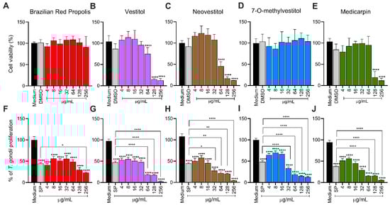 To evaluate the cytotoxicity of BRP, Vestiol, Neovestiol, 7-O-methylvestitol, and medicarpin, the MTT viability assay was performed. According to Figure 1, DMSO (0.6%; percentage used in the highest concentration of 256 µg/mL) treatments did not show toxicity for BeWo cells. The results for different concentrations of BRP and 7-O-methylvestitol showed no toxicity at any of the tested concentrations (Figure 1A,D). Vestiol and Neovestiol were toxic only at the highest concentrations (64, 128, and 256 µg/mL|**** p < 0.0001; Figure 1B,C), while medicarpin reduced cell viability only at concentrations of 128 and 256 µg/mL (**** p < 0.0001; Figure 1E) when compared to untreated BeWo cells (control group).