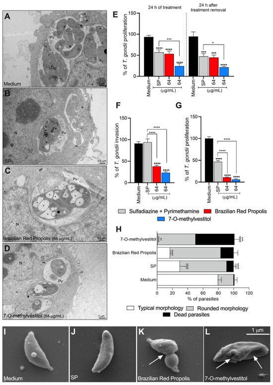 BRP and 7-O-methylvestitol irreversibly inhibit T. gondii intracellular proliferation while inducing morphological alterations in the parasite. BeWo cells were infected with T. gondii tachyzoites (MOI of 3:1) for 3 h and incubated for 24 h with BRP (64 µg/mL), 7-O-methylvestitol (64 µg/mL), SP (200 + 8 µg/mL, respectively), or culture medium only (untreated group). Representative transmission electron micrographs are demonstrated, according to the experimental situation: (A) untreated cells, (B) SP-treated cells, (C) BRP-treated cells, and (D) 7-O-methylvestitol-treated cells. Scale bars (bottom right): 0.5 and 1 μm. (E) Infected BeWo cells were treated for 24 h with BRP (64 µg/mL), 7-O-methylvestitol (64 µg/mL), SP (200 + 8 µg/mL), or culture medium only; in parallel, the same treatments were removed from infected cells, which were then maintained in a treatment-free medium for an additional 24 h. In both experimental conditions, intracellular parasite proliferation was assessed using the β-galactosidase assay. The reversibility assay evaluates the parasites’ capacity to recover from treatment and regain infectivity. T. gondii tachyzoites obtained from BeWo cells treated with BRP and 7-O-methylvestitol for 24 h were harvested and subsequently used to infect new BeWo cells for 3 h, to assess the invasion (F), or for 24 h to assess the proliferation (G). The number of tachyzoites was quantified using the β-galactosidase assay and expressed as a percentage of T. gondii invasion/proliferation. (H) T. gondii tachyzoites were treated for 1 h with BRP (64 µg/mL), 7-O-methylvestitol (64 µg/mL), SP (200 + 8 µg/mL), or culture medium only, and scanning electron microscopy was performed. Number of parasites with typical morphology, rounded morphology, or dead. Representative images are demonstrated, according to the experimental situation: (I) untreated group, (J) SP-treated parasites, (K) BRP-treated parasites, and (L) 7-O-methylvestitol-treated parasites. Scale bars: 1 μm. Data are shown as means ± standard error of the mean (SEM). Asterisks without brackets indicate comparisons versus the control group (black bar). Asterisks with brackets indicate comparisons between experimental groups. Significant differences were analyzed using a one-way ANOVA test with Sidak’s multiple comparison posttest. Differences were considered statistically significant when p < 0.05. Dg, dense granule; N, host nucleus; PV, parasitophorous vacuole; and Rp, rhoptries. White arrows indicate ultrastructural alterations.
