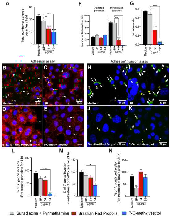 BRP and 7-O-methylvestitol interfere in early steps of T. gondii infection in BeWo cells. (A) T. gondii tachyzoites were pre-treated for 1 h with BRP (64 µg/mL), 7-O-methylvestitol (64 µg/mL), SP (200 + 8 µg/mL), or culture medium only, and then allowed to interact with paraformaldehyde-fixed BeWo cells on glass coverslips for 3 h. Subsequently, the parasites, actin filaments, and cell nuclei were stained, and the immunofluorescence assay was performed, and the number of adhered parasites was scored on 20 randomly selected fields. Representative fluorescence images are demonstrated according to the experimental situation: (B) untreated parasites, (C) SP-treated parasites, (D) BRP-treated parasites, and (E) 7-O-methylvestitol-treated parasites. (B–E) White arrowheads indicate adhered parasites. (F,G) T. gondii tachyzoites were pre-treated as described above and then used to infect BeWo cells on glass coverslips for 3 h. After, the parasites and cell nuclei were stained for immunofluorescence reaction. The numbers of adhered [red or red+/green+ (yellow)] and intracellular (green+/red−) parasites were scored on 20 randomly selected fields. The proportion of the number of intracellular tachyzoites to the total number of parasites was considered the invasion ratio. Representative fluorescence images are demonstrated according to the experimental situation: (H) untreated parasites, (I) SP-treated parasites, (J) BRP-treated parasites, and (K) 7-O-methylvestitol-treated parasites. (H–K) White arrows indicate intracellular parasites, while white asterisks mark parasites adhered to the cell surface. (L) T. gondii tachyzoites were pre-treated as described above and then used to infect BeWo cells for 3 h. The number of tachyzoites was quantified using the β-galactosidase assay and expressed as a percentage of T. gondii invasion. (M,N) BeWo cells were pre-treated for 24 h with BRP (64 µg/mL), 7-O-methylvestitol (64 µg/mL), SP (200 + 8 µg/mL), or culture medium only. Then, the cells were infected with T. gondii tachyzoites (MOI of 3:1) for 3 or 24 h to assess the invasion and proliferation, respectively. The number of tachyzoites was quantified using the β-galactosidase assay and expressed as a percentage of T. gondii invasion/proliferation. Data are shown as means ± standard error of the mean (SEM). Asterisks without brackets indicate comparisons versus the control group (black bar). Asterisks with brackets indicate comparisons between experimental groups. Significant differences were analyzed using one-way ANOVA test with Sidak’s multiple comparison posttest. Differences were considered statistically significant when p < 0.05. White arrowheads indicate parasites adhered to the cells. White arrows indicate intracellular parasites. White asterisks indicate adhered parasites. Scale bars: 20 μm.