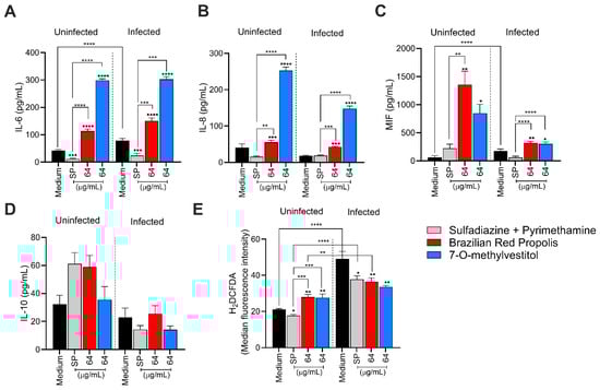 BRP and 7-O-methylvestitol lead to an increase in IL-6, IL-8, and MIF levels and alter ROS production in BeWo cells. BeWo cells were infected or not with T. gondii tachyzoites, followed by treatment for 24 h with BRP (64 µg/mL), 7-O-methylvestitol (64 µg/mL), SP (200 + 8 µg/mL), or culture medium only. Cell culture supernatants were collected for measurement of (A) IL-6, (B) IL-8, (C) MIF, and (D) IL-10. Cytokine levels were expressed in pg/mL. (E) The fluorescent probe H2DCF-DA was used to measure the production of ROS in the BeWo cells. Data are shown as means ± standard error of the mean (SEM). Asterisks without brackets indicate comparisons versus the control group (black bar). Asterisks with brackets indicate comparisons between experimental groups. Significant differences were analyzed using one-way ANOVA test with Sidak’s multiple comparison posttest. Differences were considered statistically significant when p < 0.05.