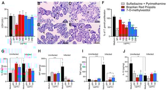 BRP and 7-O-methylvestitol inhibit T. gondii proliferation in human placental explants and modulate cytokine production. Villous explants were incubated for 24 h with BRP (128 µg/mL), 7-O-methylvestitol (128 µg/mL), SP (200 + 8 µg/mL), or culture medium only, and subsequently assessed for viability. (A) Collected villous supernatants were analyzed to determine LDH levels (U/L). Histological sections were stained with hematoxylin–eosin (HE). Representative photomicrographs of tissues are demonstrated according to the experimental situation: (B) untreated villous, (C) SP-treated villous, (D) BRP-treated villous, and (E) 7-O-methylvestitol-treated villous. (F) Villous explants were infected with T. gondii tachyzoites for 24 h, followed by treatment for additional 24 h with BRP (128 µg/mL), 7-O-methylvestitol (128 µg/mL), SP (150 + 200 μg/mL), or culture medium only. Intracellular parasite proliferation was assessed using the β-galactosidase assay and represented as percentage T. gondii proliferation, with the untreated/infected group (control) considered as 100% of parasite proliferation. Supernatant from uninfected or infected villous after treatments was collected for measurement of (G) IL-6, (H) MIF, (I) TNF, and (J) IL-10. Cytokine levels were expressed in pg/mg of tissue. Data are shown as means ± standard error of the mean (SEM). Asterisks without brackets indicate comparisons versus the control group (black bar). Asterisks with brackets indicate comparisons between experimental groups. Significant differences were analyzed using one-way ANOVA test with Sidak’s multiple comparison posttest. Differences were considered statistically significant when p < 0.05. Black arrows indicate syncytiotrophoblasts, and “M” indicates mesenchyme. Scale bars: 50 μm.