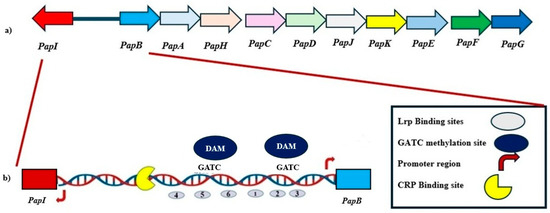 P fimbriae are defining members of the π fimbrial family [18]. The π fimbrial family encompasses a range of adhesive structures that can contribute to colonization and persistence of pathogenic E. coli and related enteric bacteria. P fimbriae are the prototypical representative of the π fimbrial family, alongside structurally and functionally related systems such as Pix and PL fimbriae in uropathogenic E. coli (UPEC), Sfp fimbriae encoded on plasmids in enterohemorrhagic E. coli (EHEC), and Pef fimbriae present in Salmonella enterica. These fimbrial systems facilitate adhesion to host tissues and are tightly regulated to adapt to changing environmental conditions and host niches [2,18,19,20,21,22]. P fimbriae are encoded by the pap operon, which comprises 11 genes encoding structural subunits, secretion machinery, and regulatory proteins (Figure 1). Among these, the transcriptional regulators PapB and PapI govern phase-variable expression of the pap genes. Notably, PapB acts as a master regulator, influencing not only its own operon but also modulating the expression of heterologous fimbrial loci.