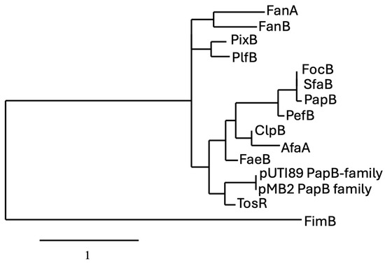 Phylogram of proteins belonging to the PapB regulator family. For comparison of the protein sequences, entries were obtained from either the NCBI (https://www.ncbi.nlm.nih.gov) or the Universal Protein Resource (UniProt) (www.uniprot.org) website. Phylogenetic analyses of protein sequences were conducted with the platform at Phylogeny (http://www.phylogeny.fr) using the default (“one click”) parameters [37]. Analyses consisted of multiple-sequence alignment with MUSCLE [38], alignment curation with GBlocks [39], maximum likelihood phylogeny analysis using PhyML 3.0 [40], and TreeDyn for generation and editing of trees (https://www.phylogeny.fr/one_task.cgi?task_type=treedyn). Specific parameters are described at the Phylogeny.fr website platform. Sequences included in the tree are from Uniprot.org. unless indicated otherwise and include from top to bottom: FanA (P07104); FanB (P07105); PixB (Q83XC7); PlfB (NCBI: AKG46875.1); FocB (Q93K76); SfaB (Q93K76); PapB (P0474); PefB (H9L498); ClpB (Q47101); AfaA (P53515); FaeB (Q47205); pUTI89 PapB-family (Q1R1Z3); pBM2 PapB-family (NCBI: WP_001322642); TosR (A0AAD2S3G5); FimB (P0ADH5), which was used as an outlier for the tree, (P0ADH5).