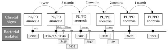 A detailed clinical timeline summarizing diagnoses, clinical signs, urinary glucose concentrations, bacterial isolates, and administered antibiotic therapies (including drug, dose, and duration) is presented in Table 1 and Figure 2 and Figure 3.