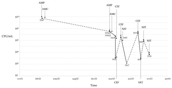 Clinical case timeline and corresponding colony-forming units per milliliters (CFU/mL), isolate detection (2987, 3394/1, 3394/2, 3418, 3432, 3483, 3517, 3631, S9, 3687, and 3729), and antibiotic therapy. The dashed line represents distinct UTI episodes. AMP, ampicillin; AMC, amoxicillin–clavulanate; CEF, cefalexin; NIT, nitrofurantoin; SXT, trimethoprim/sulfamethoxazole.