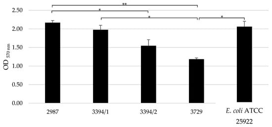 Quantification of biofilm biomass in the selected E. coli isolates. Data are shown as mean ± SD of three independent experiments. Statistically significant differences were noted with * (p < 0.05) or ** (p < 0.01).