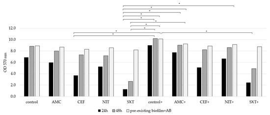 Additionally, biofilm biomass quantification was assessed in the presence of the highest glucose concentration (1000 mg/dL) combined with the MIC of each tested antibiotic (AMC, CEF, NIT, and SXT—Table 4) under three experimental setups: (1) 24 h exposure, (2) 48 h exposure, and (3) antibiotic exposure after biofilm establishment (pre-existing biofilm + AB) (Figure 6, Figure 7 and Figure S2).