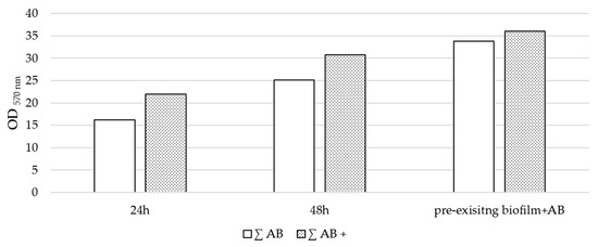 - Pre-existing biofilm + AB: Biofilms were first formed by incubating bacterial suspensions with or without 1000 mg/dL glucose for 24 h at 37 °C. After this period of biofilm establishment, antibiotics at their MIC were added, and incubation continued for an additional 24 h (total incubation time: 48 h). Biofilm biomass was then quantified at the 48 h.