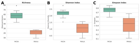 Our results showed that the FACSA cohort exhibited significantly greater richness and diversity than the PAVILA cohort. Specifically, the observed number was higher in the FACSA group (p = 0.0024), as was the Shannon index (p = 0.0013), suggesting a more diverse and evenly distributed gut microbial community. The Simpson index was also significantly different between cohorts (p = 0.0013), further supporting the presence of compositional differences in microbial communities (Figure 1).