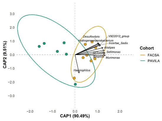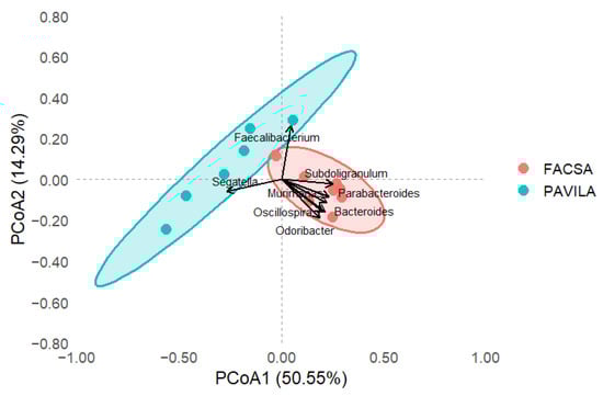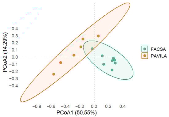 Principal Coordinates Analysis (PCoA) based on Bray–Curtis dissimilarities of genus-level microbiota profiles in FACSA and PAVILA cohorts. Each point represents an individual sample, and ellipses indicate 95% confidence intervals around group centroids. The first two PCoA axes explain 50.55% and 14.29% of the total variance, respectively. Group separation was statistically significant (PERMANOVA, F = 7.15, R2 = 0.374, p = 0.001).