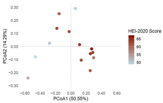 To analyse the relationship between diet quality and gut microbiota composition, PCoA based on Bray–Curtis dissimilarities was performed and coloured by HEI-2020 scores. The first two axes explained 50.55% and 14.29% of the total variance, respectively. A compositional gradient was observed: individuals with lower HEI-2020 scores (blue hues) were positioned mainly on the left side of the ordination space, whereas those with higher scores (red hues) clustered toward the right, both in the upper and lower quadrants.