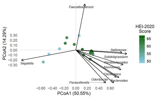 Biplot of the top 10 genera significantly associated with gut microbiota composition based on HEI-2020 diet quality scores (envfit, p < 0.1). The plot is based on Bray–Curtis dissimilarities and the first two PCoA axes, which explain 50.55% and 14.29% of the total variance, respectively. Arrows indicate the direction and strength of the association between each taxon and the compositional gradient. Genera such as Sellimonas and Subdoligranulum were aligned with higher HEI-2020 scores, while Segatella was associated with lower-quality diets.