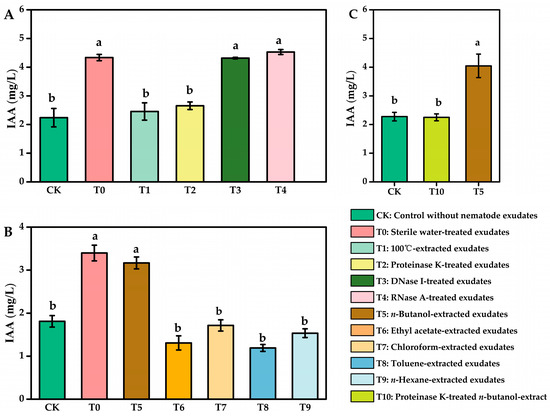 Characterization of active components in C. elegans exudates that promote IAA production by A. pascens ZZ21: (A) effects of enzymatic and heat treatments on IAA-promoting activity; (B) IAA-inducing activity of exudate extracts obtained using different organic solvents; (C) effect of protease K treatment on the n-butanol extract bioactivity. Data are expressed as mean ± SE. Values with different letters (a, b) are significantly different as determined by Duncan’s multiple-range test at p < 0.05.