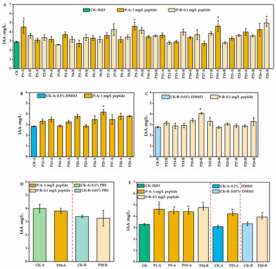 Activity validation of synthetic peptides promoting IAA production in A. pascens ZZ21: (A) effects of 18 water-soluble peptides on IAA production; (B,C) effects of 11 DMSO-soluble peptides on IAA production at (B) 1 mg/L and (C) 0.1 mg/L; (D) effect of PBS-soluble peptide on IAA production; (E) effects of six selected peptides in replicated validation assays. In panels (D,E), dashed lines are used to visually separate results from distinct experiments. Data are expressed as mean ± SE. Asterisks indicate significant differences at p < 0.05, as determined by Dunnett’s test or independent-sample t-test.