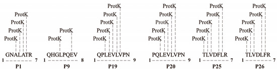 Predicted proteinase K cleavage sites in the six bioactive peptides (P1, P9, P19, P20, P25, and P26), based on PeptideCutter analysis (ExPASy). Vertical dashed lines labeled “ProtK” indicate predicted cleavage positions by proteinase K, occurring to the right side (C-terminal side) of the marked amino acids. Horizontal dashed lines represent the full-length linear peptide sequences, and the numbers at both ends indicate the position of the first and last amino acid residues.
