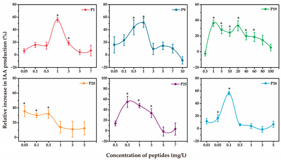 Dose-dependent curves of six peptides showing their effects on IAA production by A. pascens ZZ21. Data are expressed as mean ± SE. Asterisks indicate significant differences at p < 0.05, as determined by Dunnett’s test.