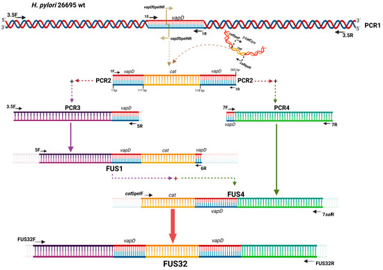 A tube with frozen competent H. pylori 26695 cells was thawed on ice for 15 min. The 500 μL of purified FUS32 product was added and mixed with 200 μL of the competent cells’ suspension. The sample was chilled on ice for 5 min. Then, the bacterial suspension and FUS32 mixture was added very slowly to the bottom of a prechilled (0.2 cm gap) electroporation cuvette. The electroporation was performed with the Bio-Rad gene pulser, and it was set up at 2.5 kV, 25 μF capacitor and a resistance of 600 Ω in parallel, and the sample was subjected to single-pulse electroporation using a time constant of 12.5 ms.